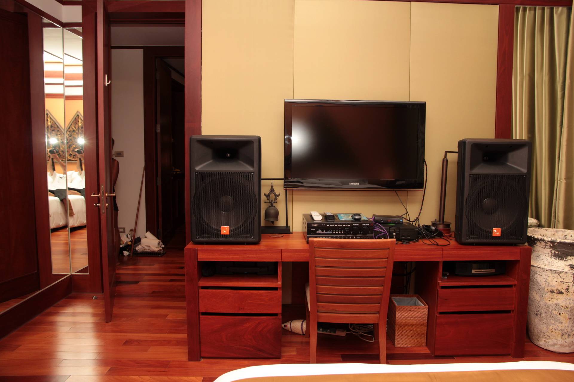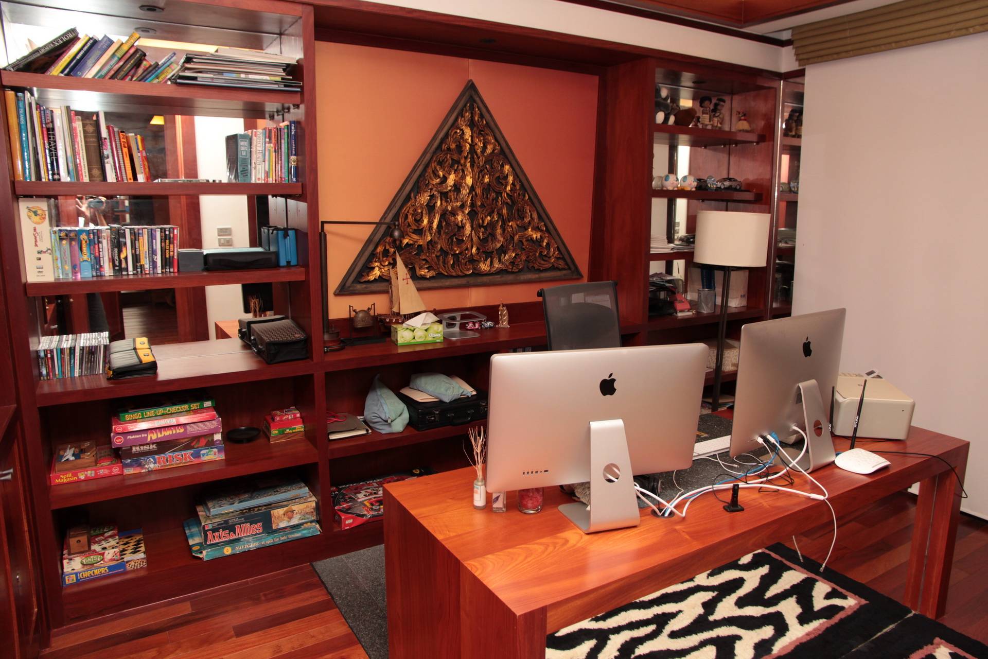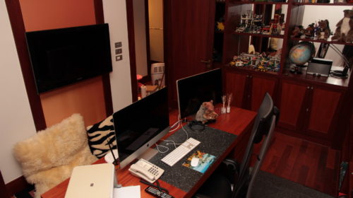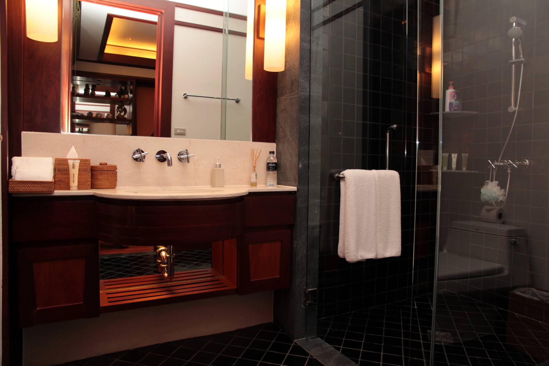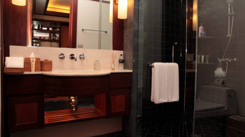 The 3rd bedroom is presently the office – study overlooking the landscaped gardens with mature trees and tropical plants. This guest bedroom can be easily refurnished with bed and bedroom furniture according to the new owners desire. It comes with en suite bathroom stylish and elegantly designed for the new owners guests to enjoy. Teak floors. shower, vanity unit, mirrors and toilet.